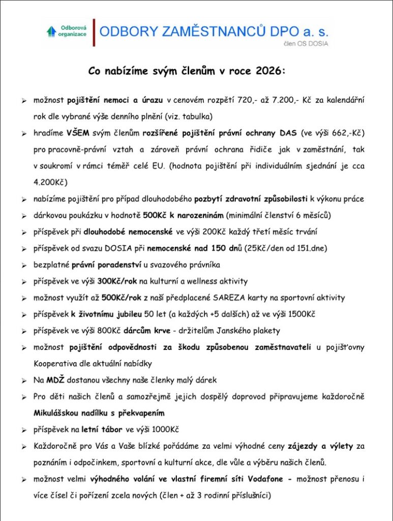 Přinášíme vám informaci, co nabízíme našim členům v roce 2026. Pokud se přihlásíte k odběru novinek z našeho webu, budete mít informace hned po zveřejnění.